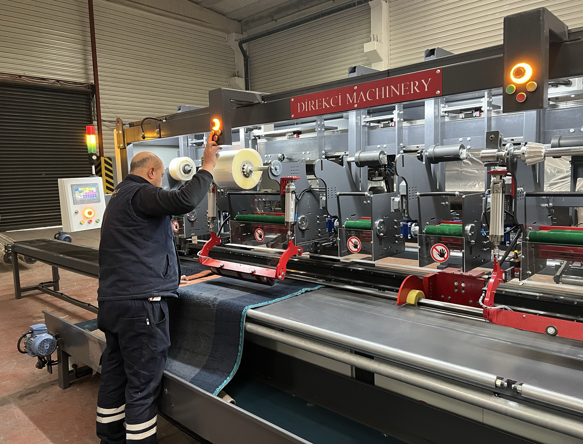 Bir yada bir çok halının aynı anda, istenilen sıklıkta ve hatasız bir şekilde, pvc yada streç kullanılarak sarılabilmesi ve sonrasında etiket yerleştirma işleminin yapılabilmesi için dizayn edilmiş bir makinedir